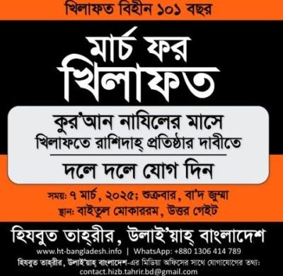 এক শুক্রবার ,৭ মার্চ ২০২৫। নিষিদ্ব ঘোষিত হিযবুত তাহ্রীর পূর্ব ঘোষিত ‘ মার্চ ফর খিলাফত’ কর্মসূচি পালন করে। ৭ মার্চের সপ্তাহ খানেক আগে থেকেই ঢাকার দেওয়ালে হিযবুত তাহিরীর পোস্টার দেখা